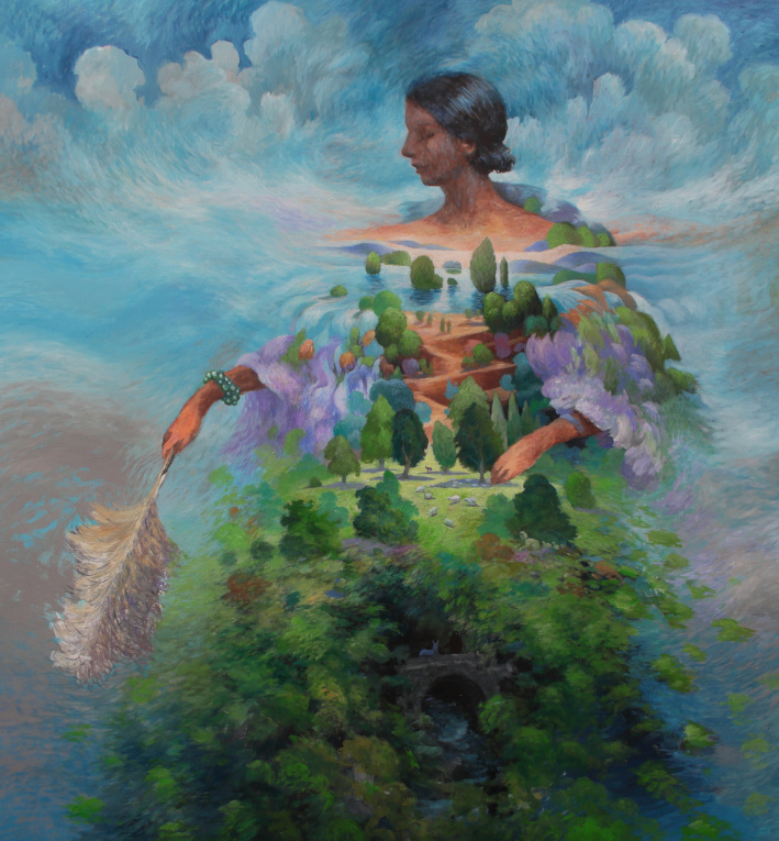 Toistuva teema maalauksissani on ajatus kahdesta maailmasta. Ensimmäinen maailma on se mitä näemme ja tunnemme ja jossa elämme arkeamme, toinen maailma on unen, myyttien ja varjon maailma. Nämä kaksi todellisuutta eivät leikkaannu toisistaan erilleen terävästi vaan ovat olemassa limittäin ja vuorovaikutuksessa.