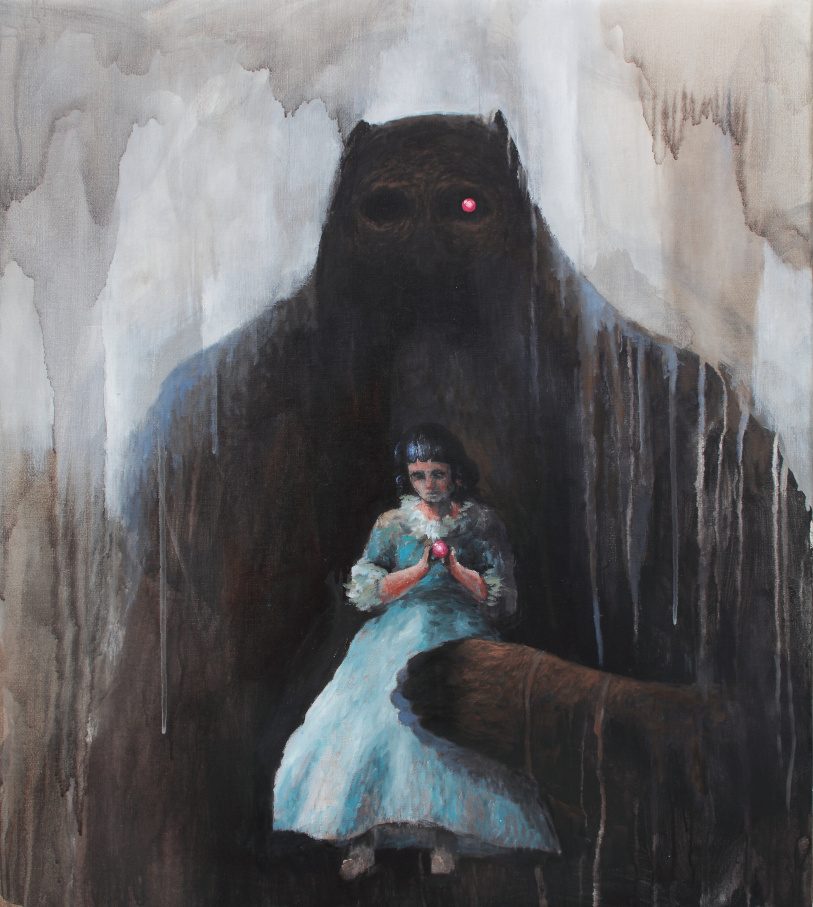 Maalasin ensimmäisen luonnosmaisen teoksen tästä aiheesta näyttelyyni ”Vastarinta” Galleria Beckeriin 2024 loppuvuodesta. Teos oli pieni ja tein sen melkein vahingossa. Se lojui pitkään odottamassa viimeistelyä ja palasin teokseen aivan näyttelyn kynnyksellä. Hirviö ojentaa pienelle tytölle loistavan timantin, joka on hirviön toinen silmä. Ele on odottamaton ja epäitsekäs. Hirviö lahjoittaa puolet kaikkein arvokkaimmastaan. Lisäsin silmäteeman viimeisenä ja teos sai uudenlaisen käänteen. En ihan heti tunnistanut teoksen sisällöllistä voimaa. Vasta kun näyttely oli ripustettu, ymmärsin miten tärkeä teos olikaan. Se tuntui vangitsevan jotain kaunista mutta satumaisella ja synkällä tavalla. Halusin jatkaa työn parissa, koska tämä pieni teos tuntui vasta lähtölaukaukselta johonkin suurempaan teemaan. Olen luonut Auran gallerian näyttelyyn tälle teemalle oman pienen maailmansa ja maalannut uusia versioita lahjateemaasta. Tekemisen ja toiston kautta aiheeseen on löytynyt uusia kierroksia ja jatkoa. Halusin tässä näyttelyssä esitellä aiheen työstöä ja pohdiskelua, siksi samoja aiheita on esillä eri kokoisina ja pienin variaatioin. Tämä kuvaa hyvin itse työskentelyä, jossa pienet yksityiskohdat ja eleet ovat hyvin tärkeitä: miten käsi ojentuu tai minne katse on suunnattu, mikä on tunnelma tai mittakaava?
